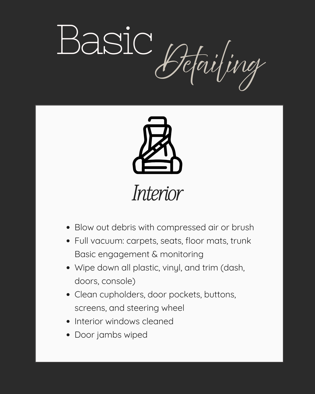 We recommend removing personal items from your vehicle to ensure a thorough cleaning experience.