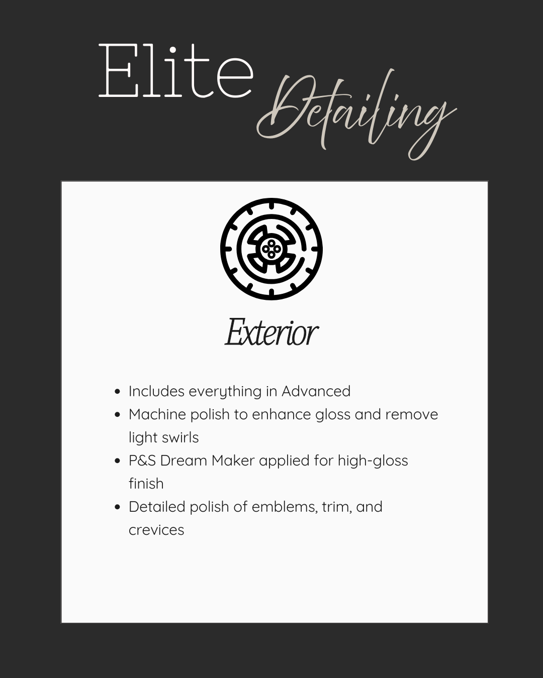 Exterior detailing includes washing, waxing, polishing, and restoring the exterior surfaces, including paint, chrome, windows, and tires.